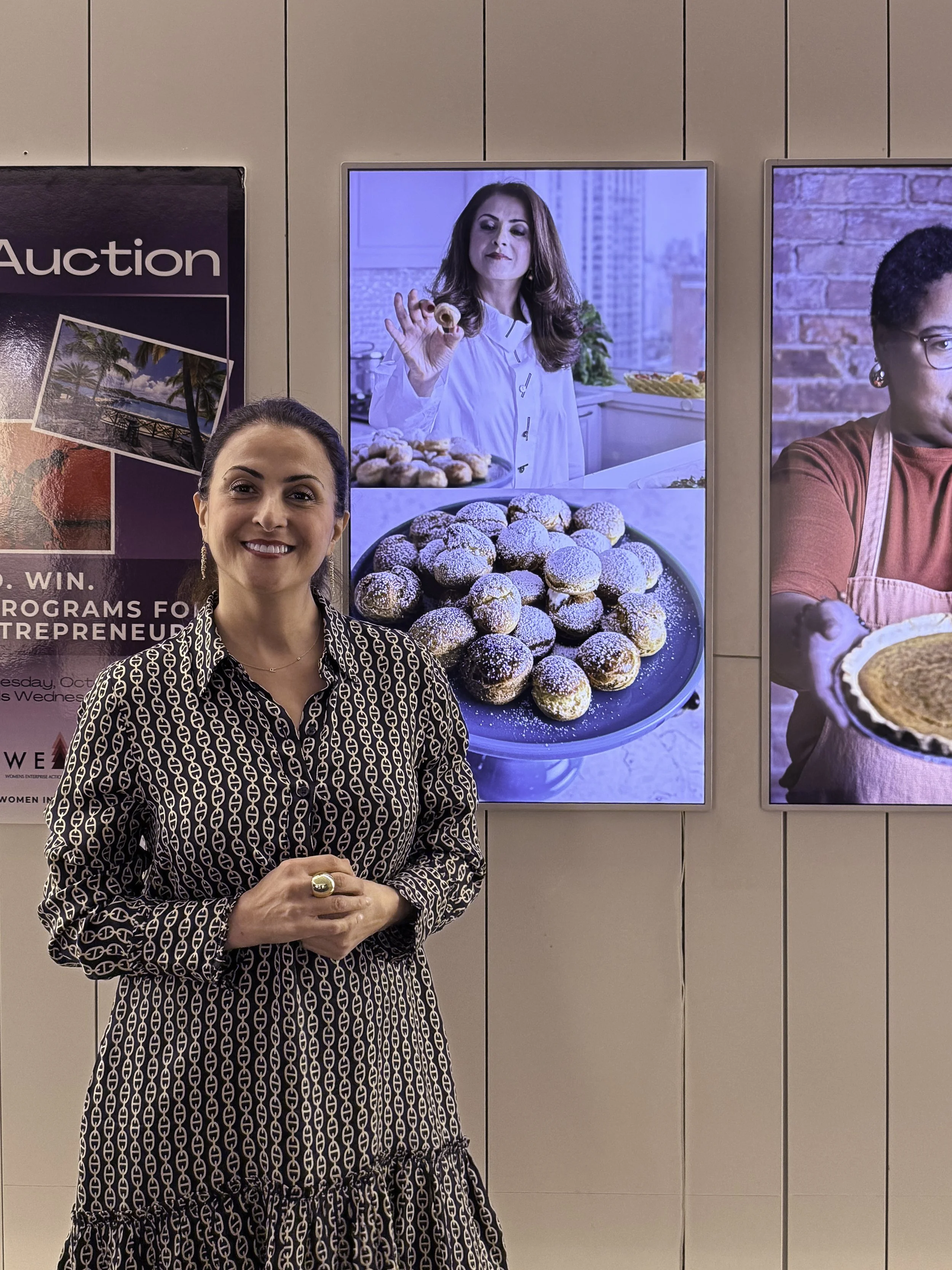 Roshanak Yousefian, founder of Popilee Patisserie, poses in front of her portrait